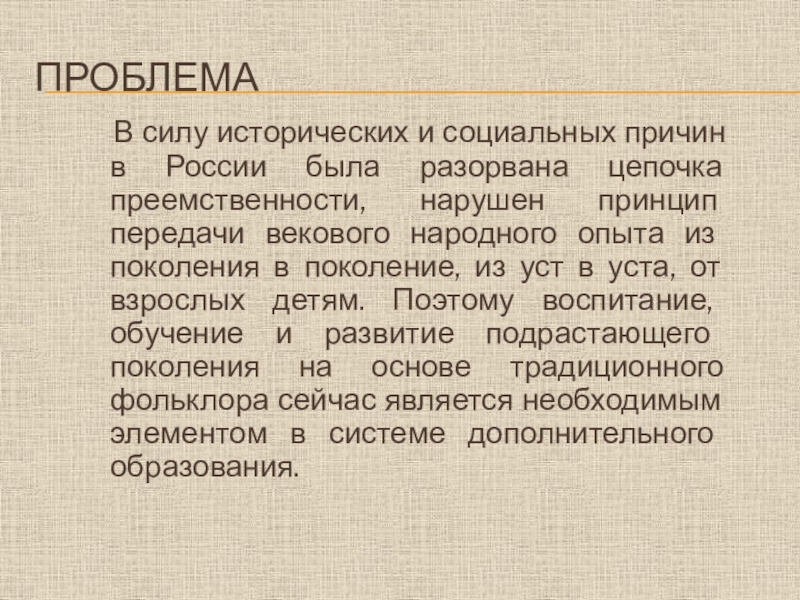 разорвана цепочка преемственности, нарушен принцип передачи векового народного опыта из поколения в поколение, из уст в уста, от взрослых детям. Поэтому воспитание, обучение и развитие подрастающего поколения на основе традиционного фольклора сейчас является необходимым элементом в системе дополнительного образования.