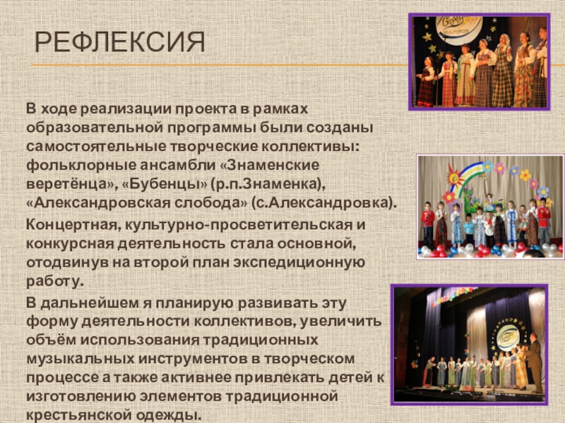 В дальнейшем я планирую развивать эту форму деятельности коллективов, увеличить объём использования традиционных музыкальных инструментов в творческом процессе а также активнее привлекать детей к изготовлению элементов традиционной крестьянской одежды.