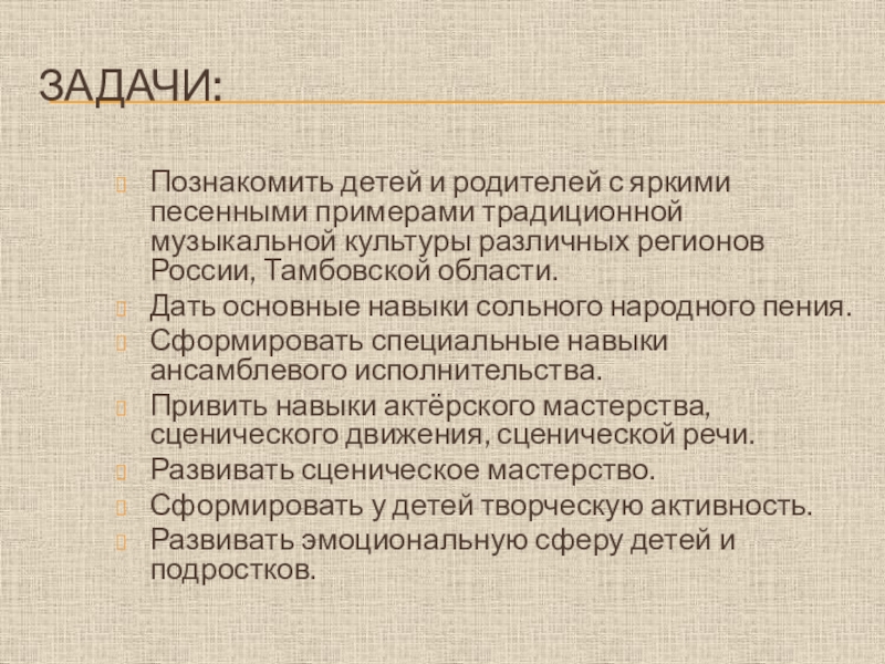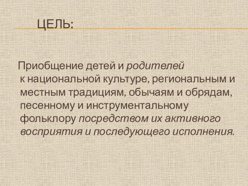 Познакомить детей и родителей с яркими песенными примерами традиционной музыкальной культуры