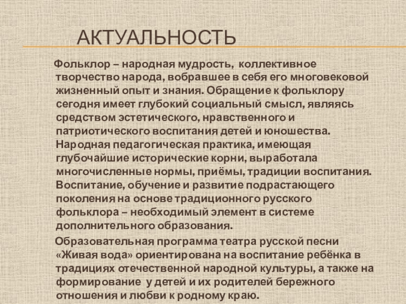 Образовательная программа театра русской песни «Живая вода» ориентирована на воспитание ребёнка в традициях отечественной народной культуры, а также на формирование у детей и их родителей бережного отношения и любви к родному краю.