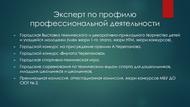 Эксперт по профилю профессиональной деятельностиГородская Выставка технического и декоративно-прикладного творчества детей и учащейся молодежи (член жюри
