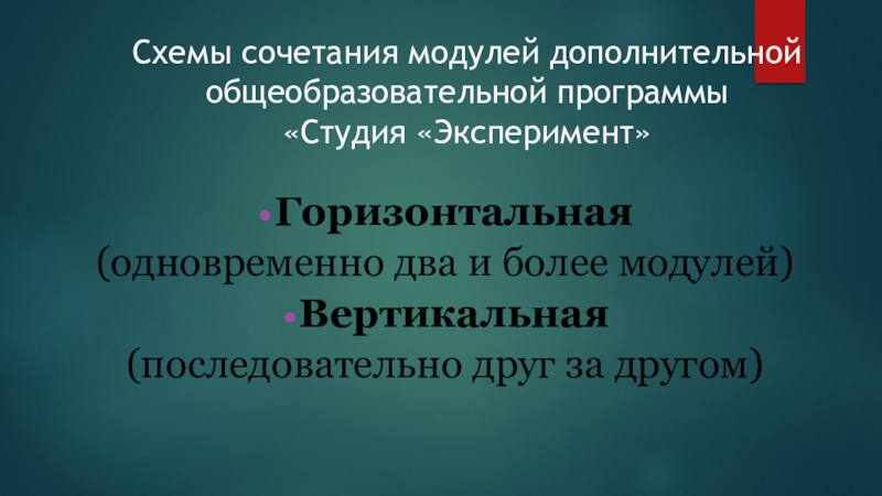 Схемы сочетания модулей дополнительной общеобразовательной программы  «Студия «Эксперимент»Горизонтальная (одновременно два и более модулей)Вертикальная (последовательно друг за