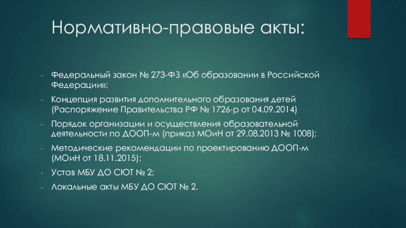 Нормативно-правовые акты: Федеральный закон № 273-ФЗ «Об образовании в Российской Федерации»;Концепция развития дополнительного образования детей (Распоряжение Правительства
