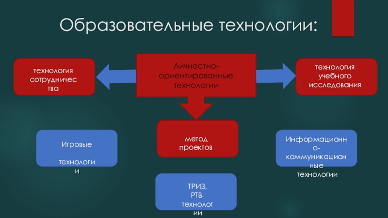 Образовательные технологии:Личностно-ориентированные технологиитехнология сотрудничестватехнология учебного исследованияметод проектовИгровые технологии Информационно-коммуникационные технологии ТРИЗ, РТВ-технологии