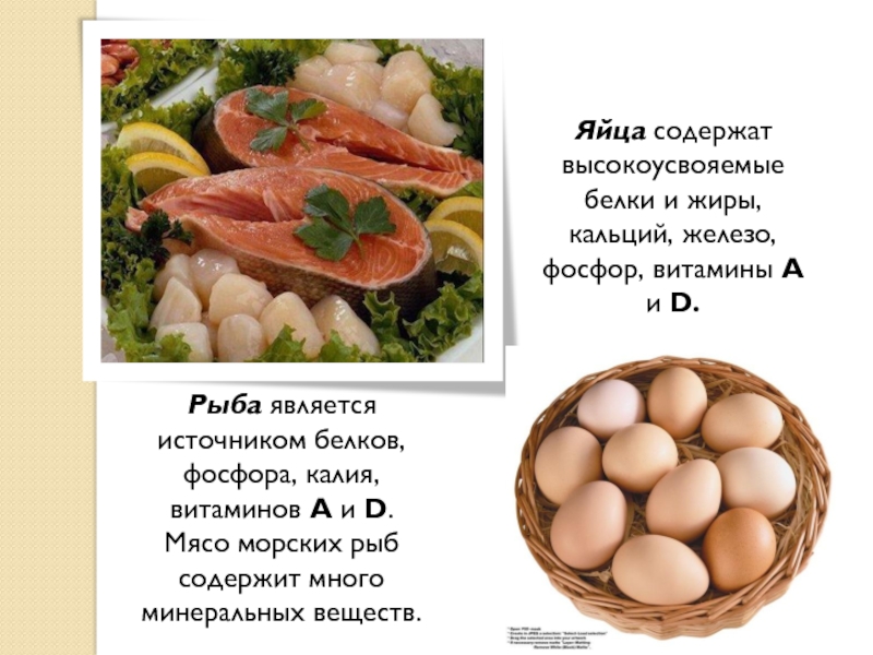 Слайд 12Рыба является источником белков, фосфора, калия, витаминов А и D. Мясо