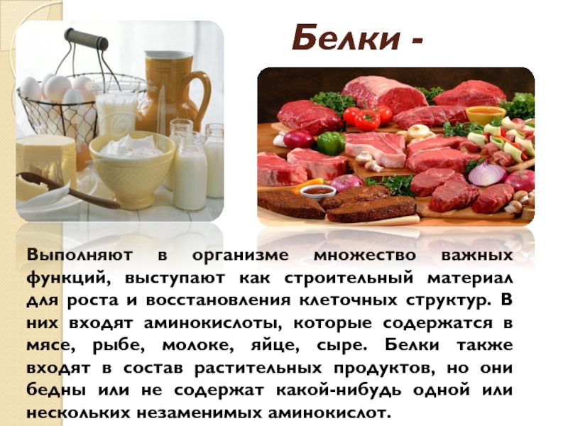 для роста и восстановления клеточных структур. В них входят аминокислоты, которые содержатся в мясе, рыбе, молоке, яйце, сыре. Белки также входят в состав растительных продуктов, но они бедны или не содержат какой-нибудь одной или нескольких незаменимых аминокислот.