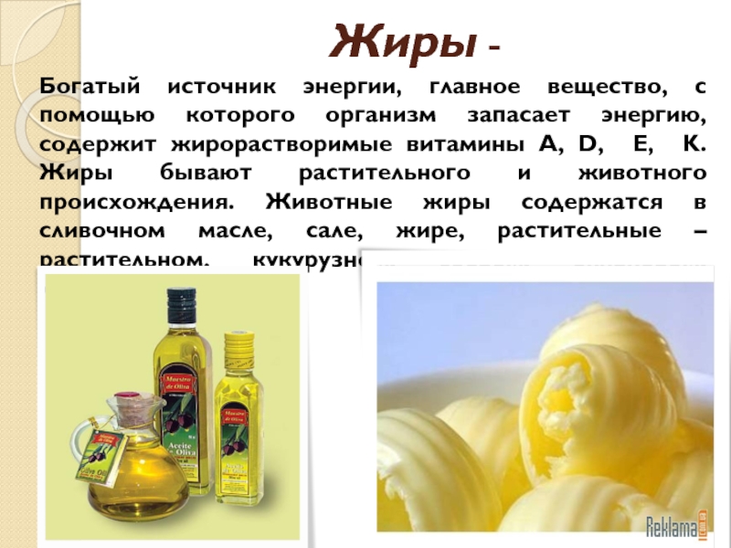 энергию, содержит жирорастворимые витамины A, D, E, K. Жиры бывают растительного и животного происхождения. Животные жиры содержатся в сливочном масле, сале, жире, растительные – растительном, кукурузном, соевом, оливковом, хлопковом маслах.