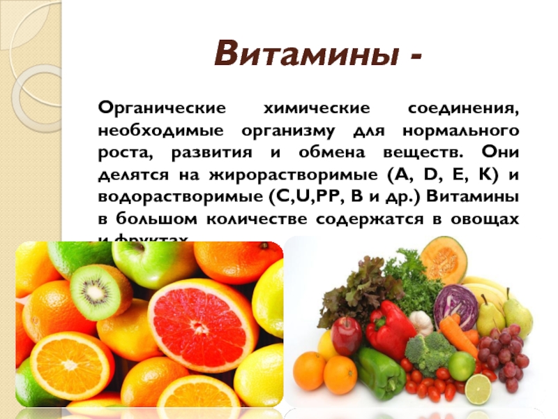 обмена веществ. Они делятся на жирорастворимые (A, D, E, K) и водорастворимые (C,U,PP, B и др.) Витамины в большом количестве содержатся в овощах и фруктах.