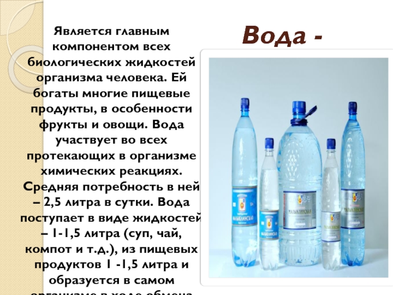 многие пищевые продукты, в особенности фрукты и овощи. Вода участвует во всех протекающих в организме химических реакциях. Средняя потребность в ней – 2,5 литра в сутки. Вода поступает в виде жидкостей – 1-1,5 литра (суп, чай, компот и т.д.), из пищевых продуктов 1 -1,5 литра и образуется в самом организме в ходе обмена веществ (0,3 – 0,4 литра).