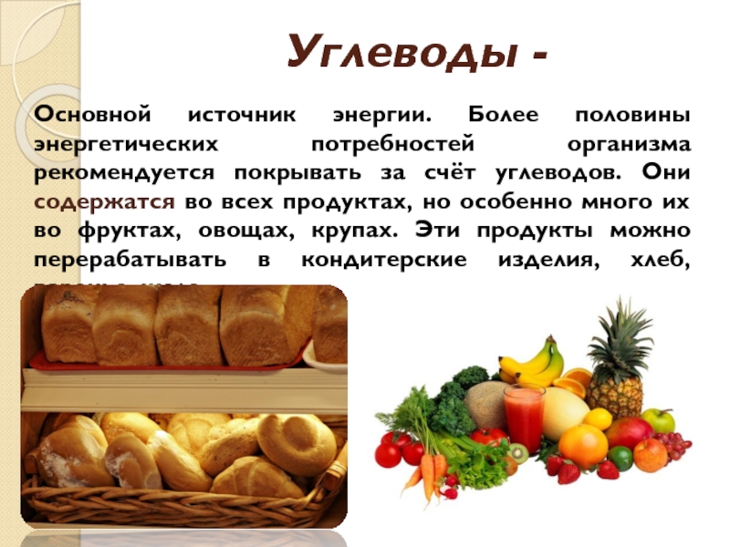 за счёт углеводов. Они содержатся во всех продуктах, но особенно много их во фруктах, овощах, крупах. Эти продукты можно перерабатывать в кондитерские изделия, хлеб, варенье, желе.