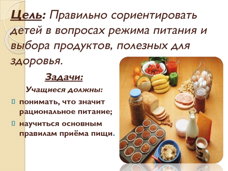 Слайд 2Цель: Правильно сориентировать детей в вопросах режима питания и выбора продуктов,