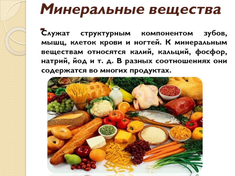 К минеральным веществам относятся калий, кальций, фосфор, натрий, йод и т. д. В разных соотношениях они содержатся во многих продуктах.