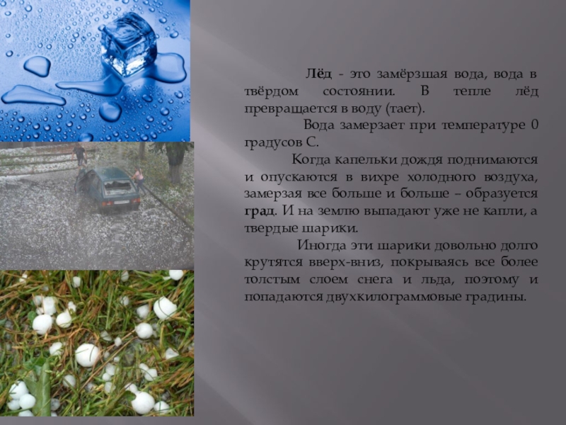 Когда капельки дождя поднимаются и опускаются в вихре холодного воздуха, замерзая все больше и больше – образуется град. И на землю выпадают уже не капли, а твердые шарики.