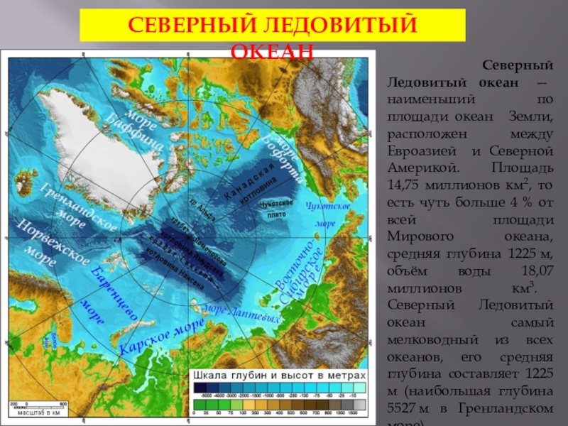 Земли, расположен между Евроазией и Северной Америкой. Площадь 14,75 миллионов км2, то есть чуть больше 4 % от всей площади Мирового океана, средняя глубина 1225 м, объём воды 18,07 миллионов км3. Северный Ледовитый океан самый мелководный из всех океанов, его средняя глубина составляет 1225 м (наибольшая глубина 5527 м в Гренландском море).