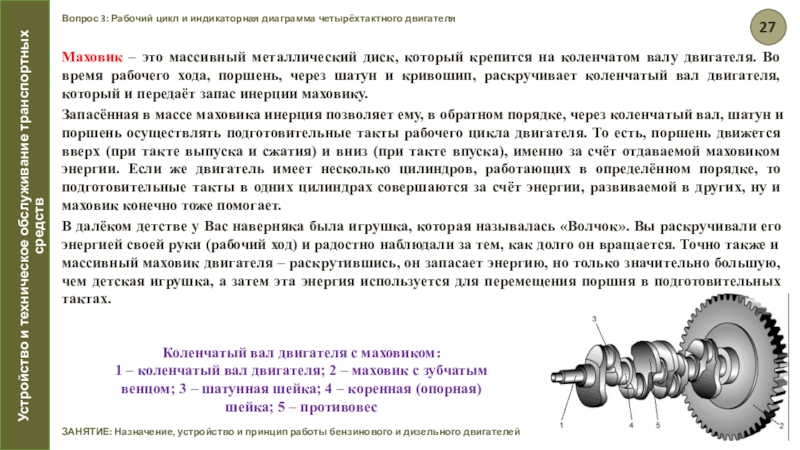 В далёком детстве у Вас наверняка была игрушка, которая называлась «Волчок». Вы раскручивали его энергией своей руки (рабочий ход) и радостно наблюдали за тем, как долго он вращается. Точно также и массивный маховик двигателя – раскрутившись, он запасает энергию, но только значительно большую, чем детская игрушка, а затем эта энергия используется для перемещения поршня в подготовительных тактах.