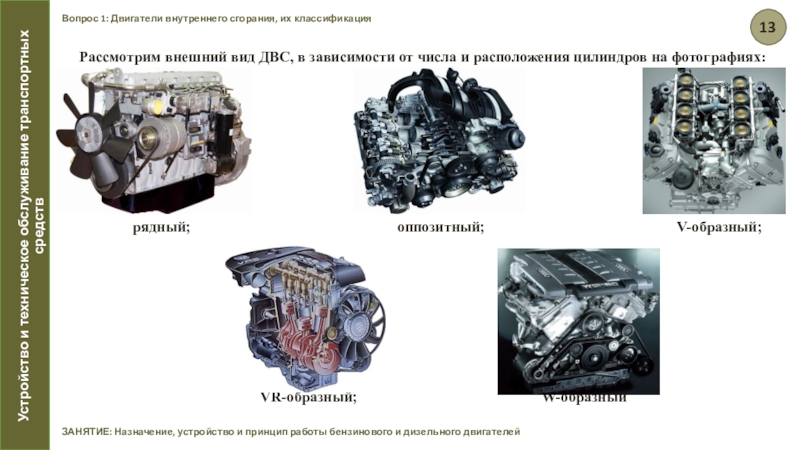 по расположению цилиндров – на двигатели с вертикальным или наклонным расположением цилиндров в один ряд, на V-образные двигатели с различным углом развала, в том числе под углом 180°, которые называются оппозитными;