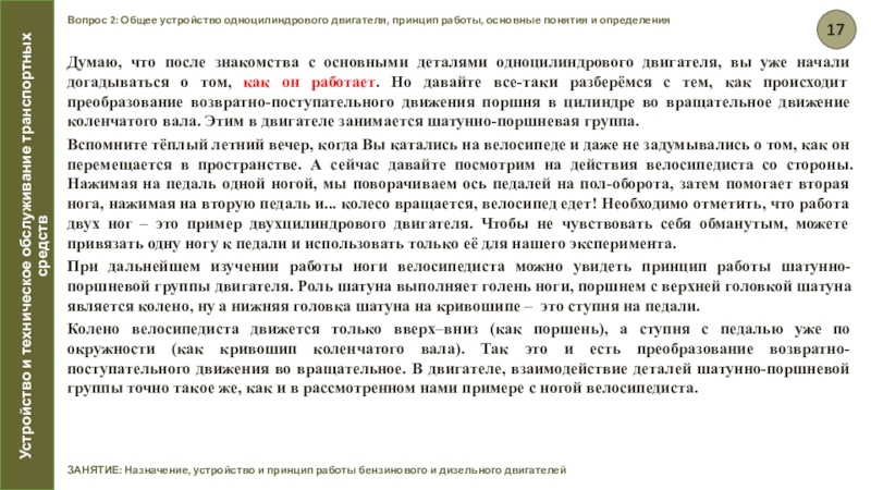 Вспомните тёплый летний вечер, когда Вы катались на велосипеде и даже не задумывались о том, как он перемещается в пространстве. А сейчас давайте посмотрим на действия велосипедиста со стороны. Нажимая на педаль одной ногой, мы поворачиваем ось педалей на пол-оборота, затем помогает вторая нога, нажимая на вторую педаль и... колесо вращается, велосипед едет! Необходимо отметить, что работа двух ног – это пример двухцилиндрового двигателя. Чтобы не чувствовать себя обманутым, можете привязать одну ногу к педали и использовать только её для нашего эксперимента.