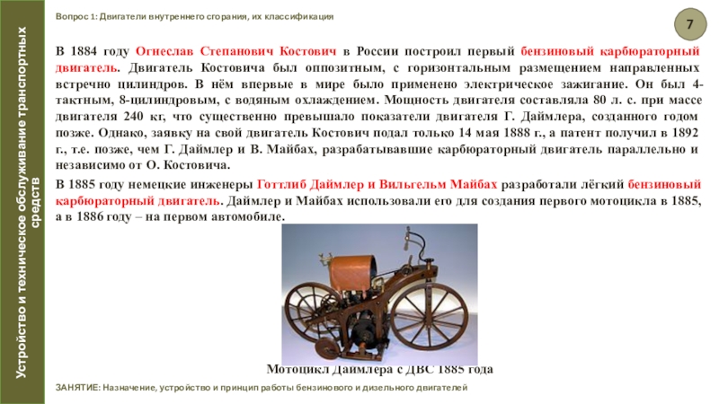 В 1884 году Огнеслав Степанович Костович в России построил первый бензиновый карбюраторный двигатель. Двигатель Костовича был оппозитным, с горизонтальным размещением направленных встречно цилиндров. В нём впервые в мире было применено электрическое зажигание. Он был 4-тактным, 8-цилиндровым, с водяным охлаждением. Мощность двигателя составляла 80 л. с. при массе двигателя 240 кг, что существенно превышало показатели двигателя Г. Даймлера, созданного годом позже. Однако, заявку на свой двигатель Костович подал только 14 мая 1888 г., а патент получил в 1892 г., т.е. позже, чем Г. Даймлер и В. Майбах, разрабатывавшие карбюраторный двигатель параллельно и независимо от О. Костовича.