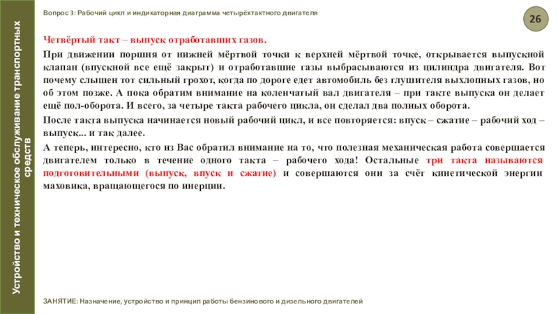 Четвёртый такт – выпуск отработавших газов, служит для освобождения цилиндра от отработавших газов.