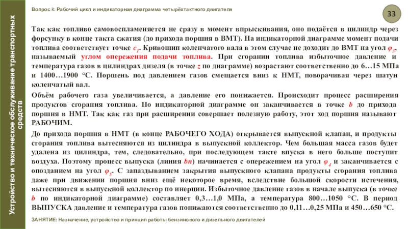 Так как топливо самовоспламеняется не сразу в момент впрыскивания, оно подаётся в цилиндр через форсунку в конце такта сжатия (до прихода поршня в ВМТ). На индикаторной диаграмме момент подачи топлива соответствует точке c1. Кривошип коленчатого вала в этом случае не доходит до ВМТ на угол φ3, называемый углом опережения подачи топлива. При сгорании топлива избыточное давление и температура газов в цилиндрах дизеля (в точке z по диаграмме) возрастают соответственно до 6…15 МПа и 1400…1900 °С. Поршень под давлением газов смещается вниз к НМТ, поворачивая через шатун коленчатый вал.