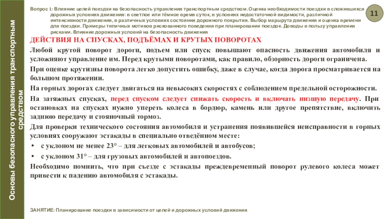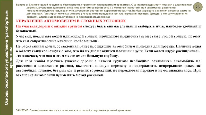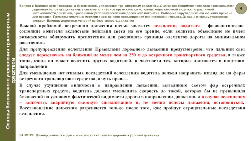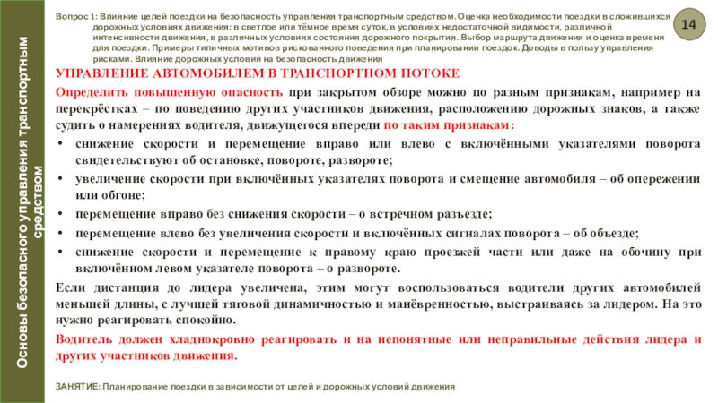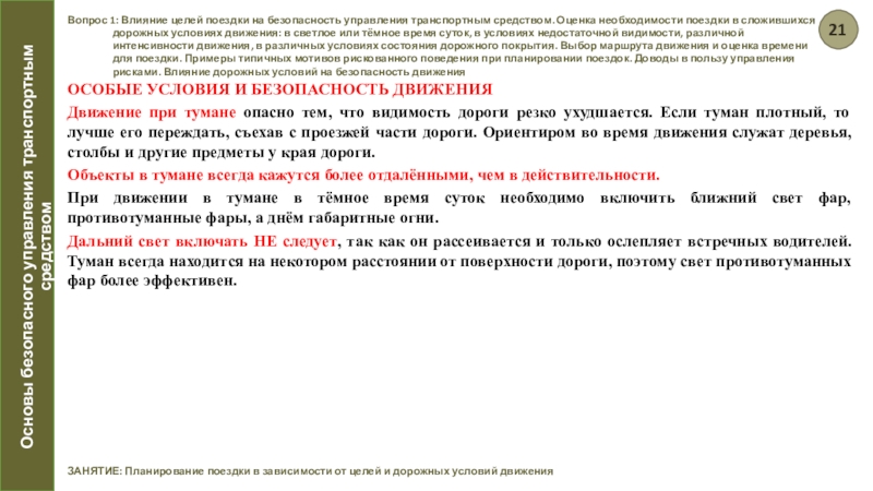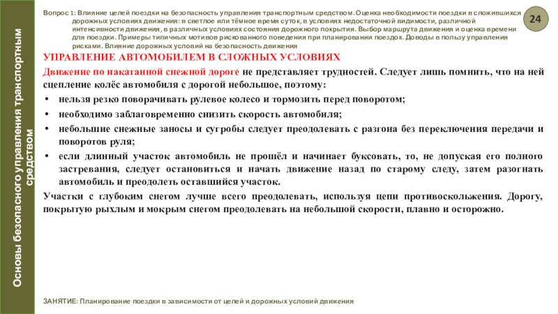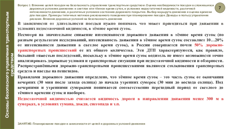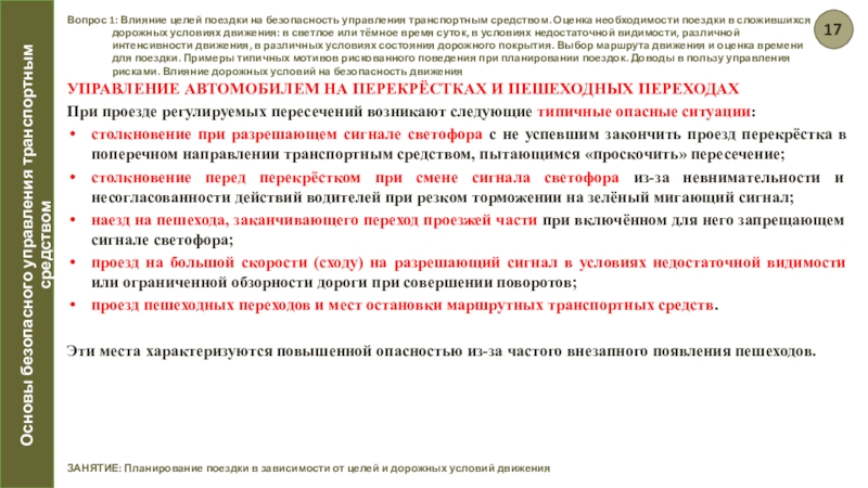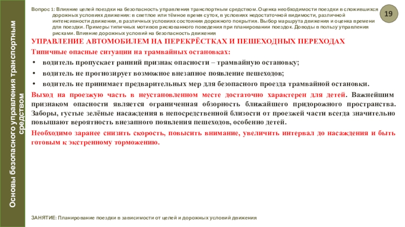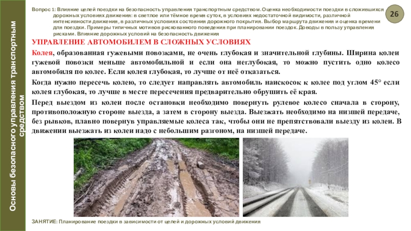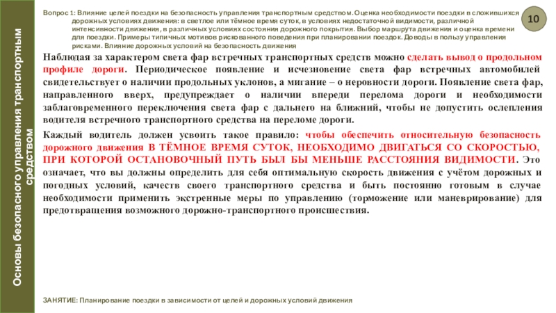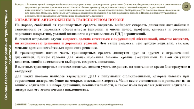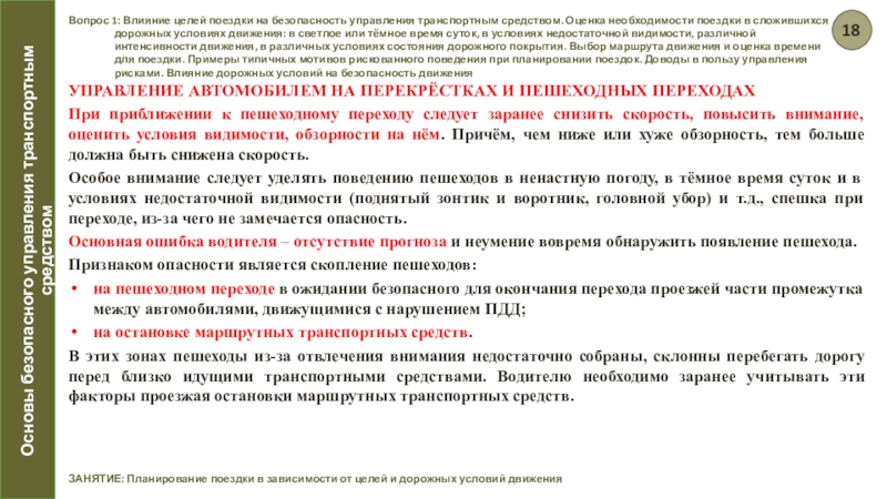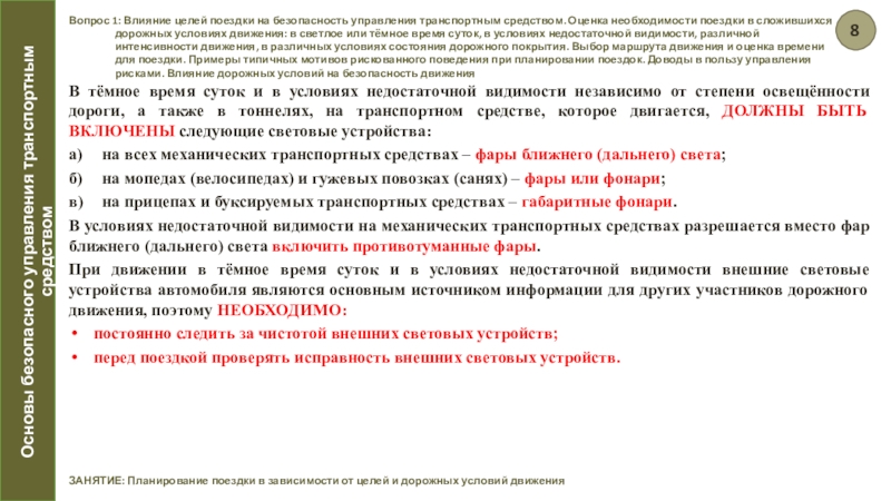 Влияние целей поездки на безопасность управления транспортным средством. Оценка необходимости поездки в сложившихся дорожных условиях движения: в светлое или тёмное время суток, в условиях недостаточной видимости, различной интенсивности движения, в различных условиях состояния дорожного покрытия. Выбор маршрута движения и оценка времени для поездки. Примеры типичных мотивов рискованного поведения при планировании поездок. Доводы в пользу управления рисками. Влияние дорожных условий на безопасность движения.