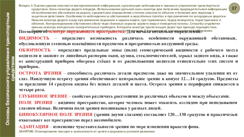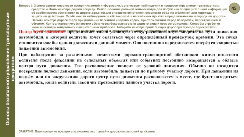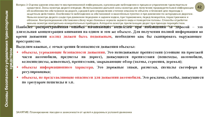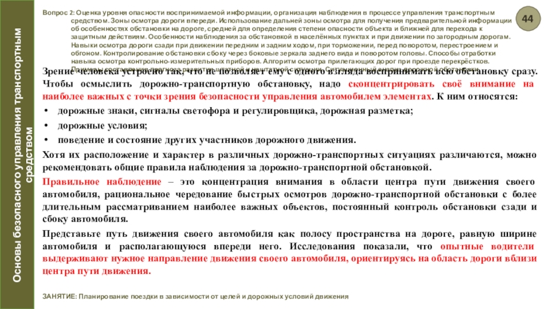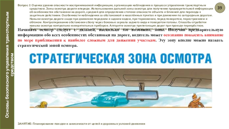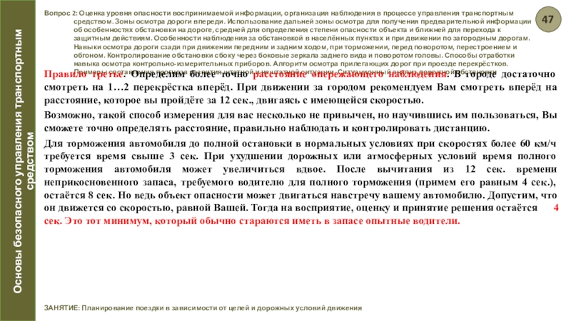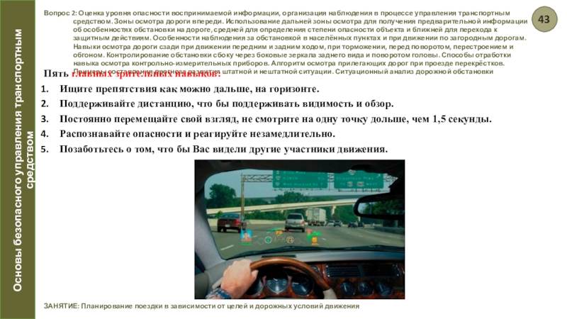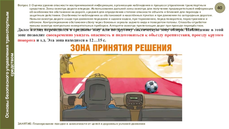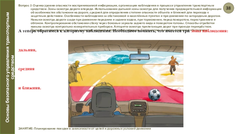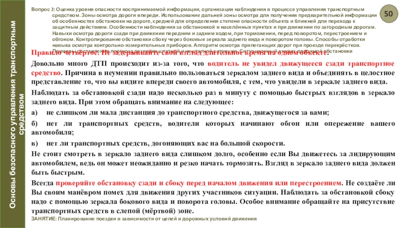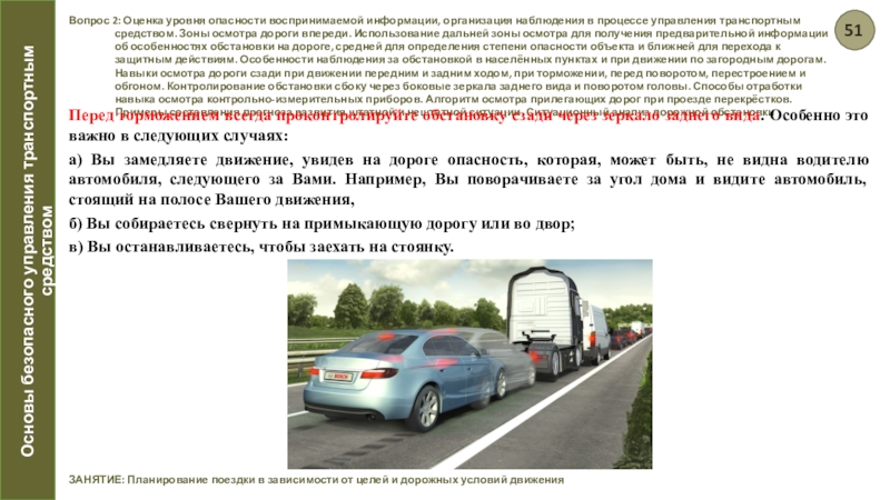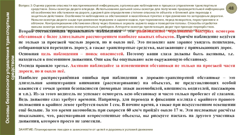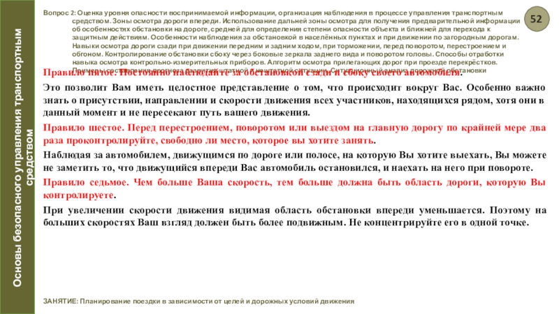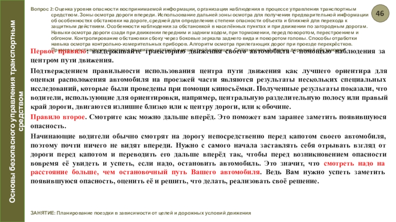 Оценка уровня опасности воспринимаемой информации, организация наблюдения в процессе управления транспортным средством. Зоны осмотра дороги впереди. Использование дальней зоны осмотра для получения предварительной информации об особенностях обстановки на дороге, средней для определения степени опасности объекта и ближней для перехода к защитным действиям. Особенности наблюдения за обстановкой в населённых пунктах и при движении по загородным дорогам. Навыки осмотра дороги сзади при движении передним и задним ходом, при торможении, перед поворотом, перестроением и обгоном. Контролирование обстановки сбоку через боковые зеркала заднего вида и поворотом головы. Способы отработки навыка осмотра контрольно-измерительных приборов. Алгоритм осмотра прилегающих дорог при проезде перекрёстков. Примеры составления прогноза развития штатной и нештатной ситуации. Ситуационный анализ дорожной обстановки.