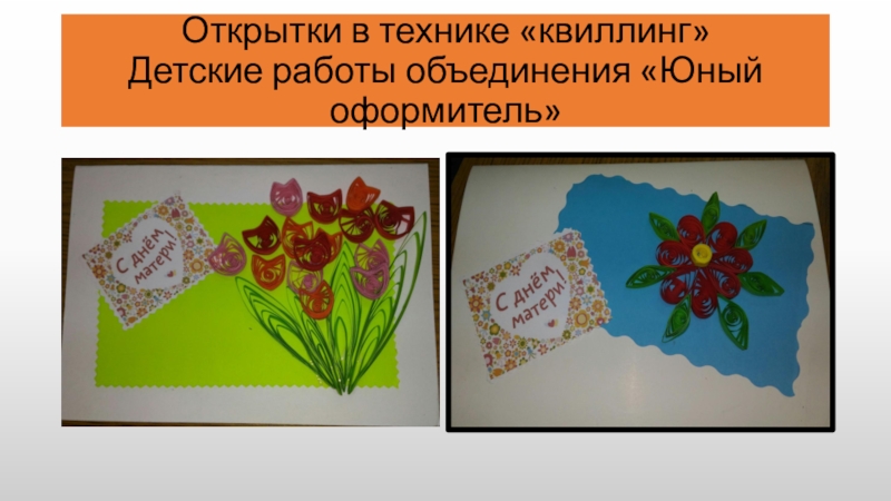 Слайд 1Открытки в технике «квиллинг» Детские работы объединения «Юный оформитель»