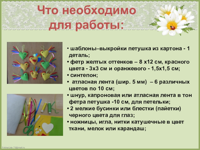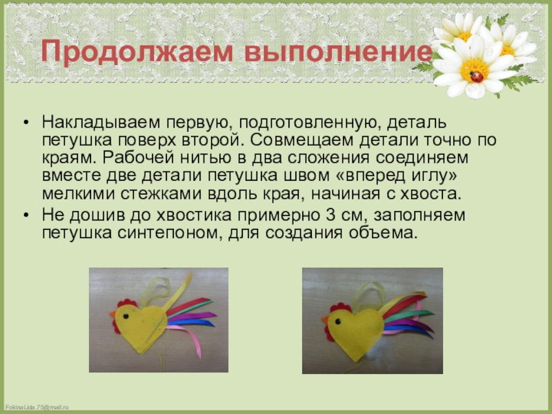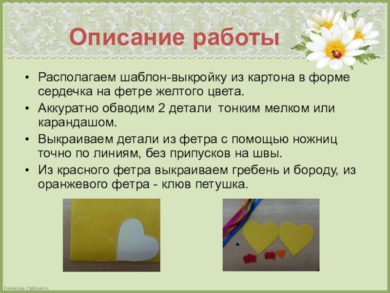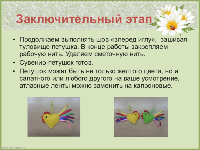 Презентация, доклад по декоративно-прикладному творчеству Петушок из фетра