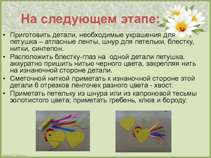 На следующем этапе:Приготовить детали, необходимые украшения для петушка – атласные ленты, шнур для петельки, блестку, нитки, синтепон.