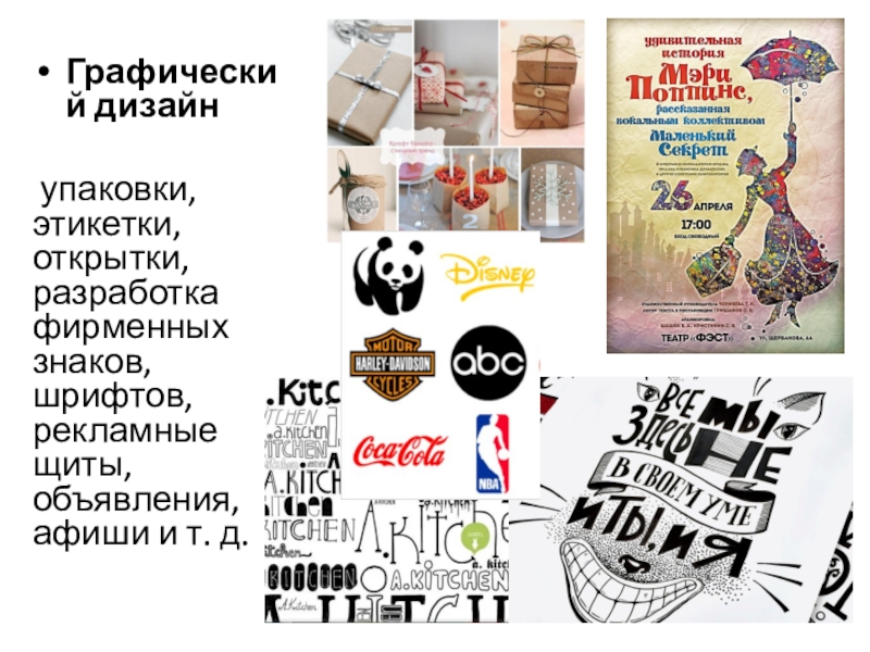 Графический дизайн упаковки, этикетки, открытки, разработка фирменных знаков, шрифтов, рекламные щиты, объявления, афиши и т. д.