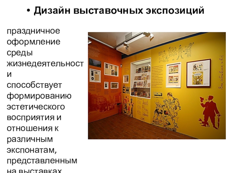 Дизайн выставочных экспозицийпраздничное оформление среды жизнедеятельностиспо­собствует формированию эстетического восприятия и отношения к различным экспонатам, представленным на выставках.