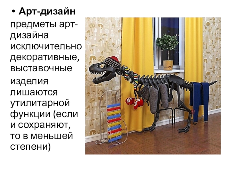 Арт-дизайн предметы арт- дизайна исключительно декоративные, выставочные изделия лишаются утилитарной функции (если и сохраняют, то в меньшей степени)
