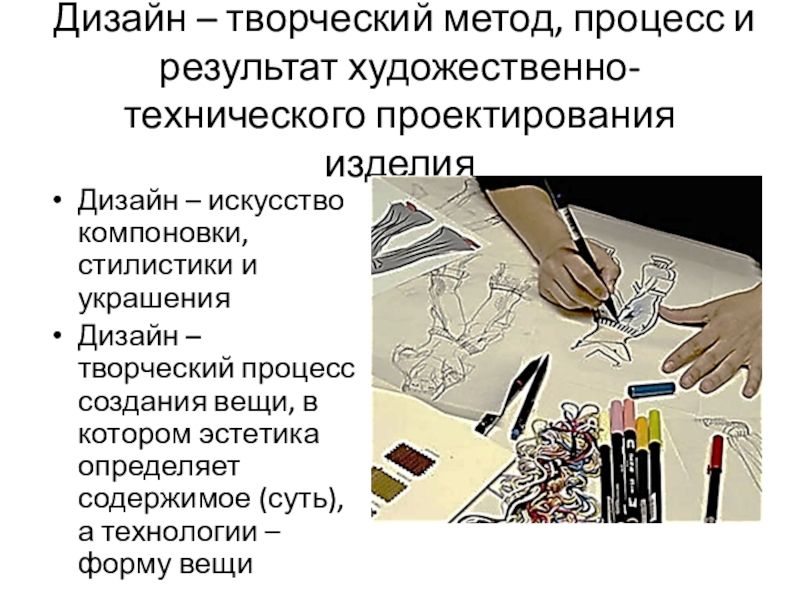 Слайд 3Дизайн – творческий метод, процесс и результат художественно-технического проектирования изделия