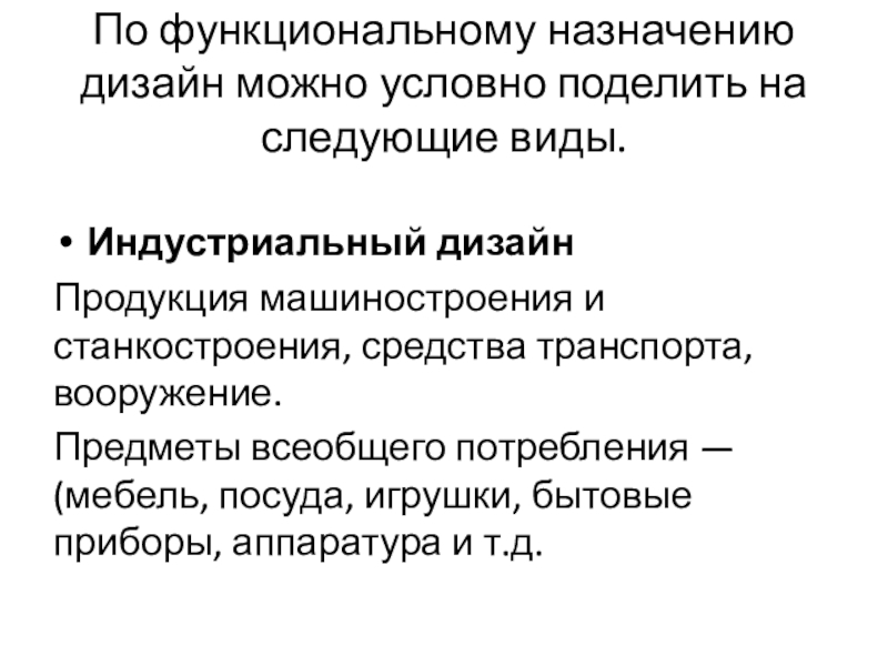 По функциональному назначению дизайн можно условно поделить на следующие виды.Индустриальный дизайнПродукция машиностроения и станкостроения, средства транспорта, вооружение.Предметы