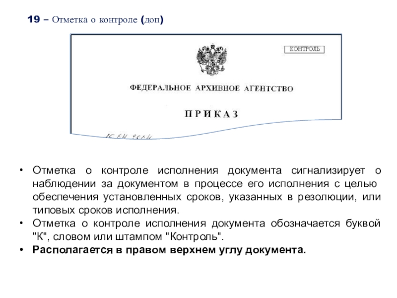 Отметка о контроле исполнения документа обозначается буквой "К", словом или штампом "Контроль".