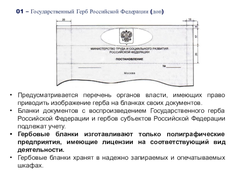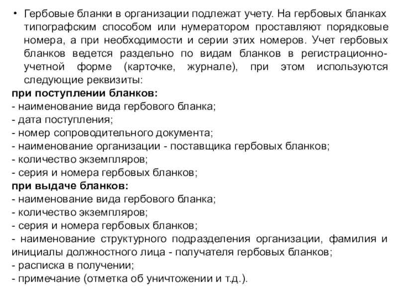Слайд 14Гербовые бланки в организации подлежат учету. На гербовых бланках типографским способом