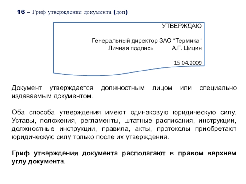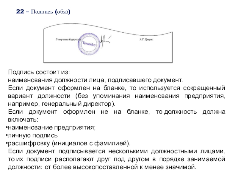 Если документ оформлен на бланке, то используется сокращенный вариант должности (без упоминания наименования предприятия, например, генеральный директор).