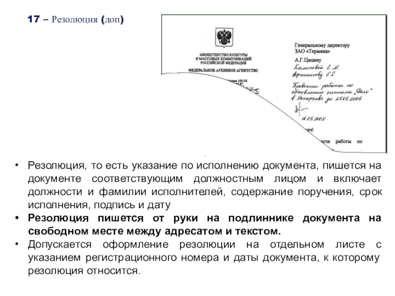 Допускается оформление резолюции на отдельном листе с указанием регистрационного номера и даты документа, к которому резолюция относится.
