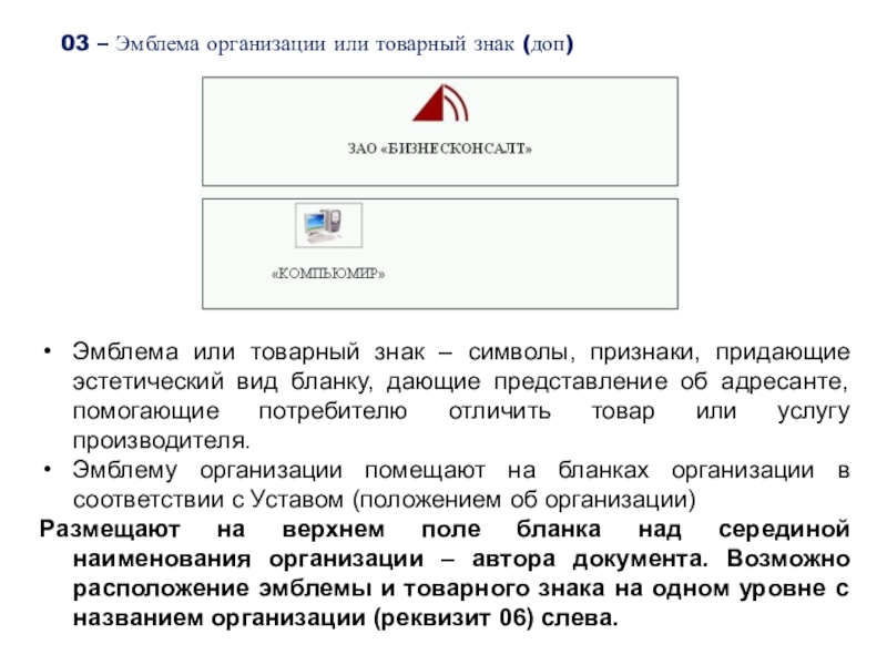 Изображение герба размещают на бланках в пределах квадрата со стороной 20 мм, над серединой строки с наименованием организации (реквизит 06)