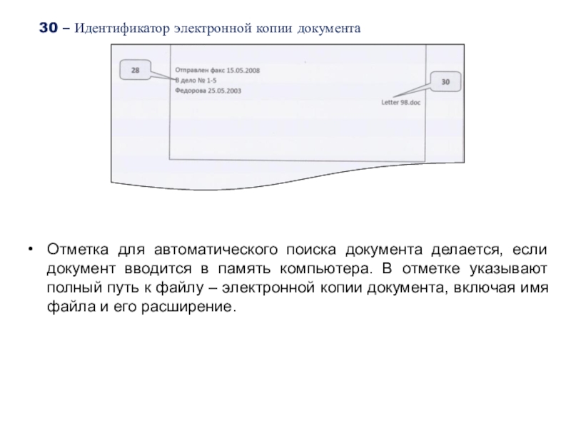 если документ вводится в память компьютера. В отметке указывают полный путь к файлу – электронной копии документа, включая имя файла и его расширение.