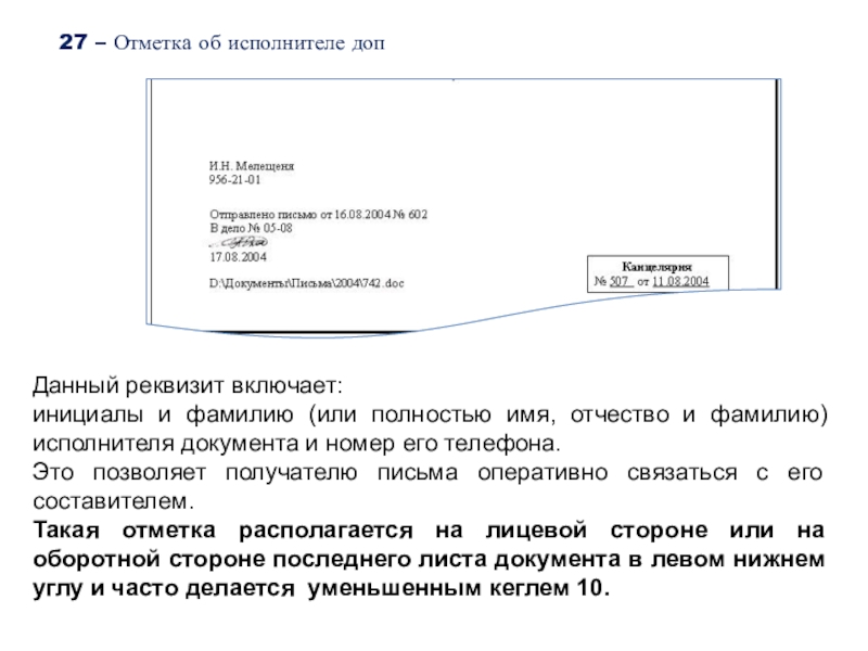 Такая отметка располагается на лицевой стороне или на оборотной стороне последнего листа документа в левом нижнем углу и часто делается уменьшенным кеглем 10.