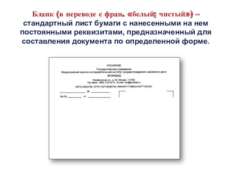 Слайд 5Бланк (в переводе с фран. «белый; чистый») – стандартный лист бумаги с