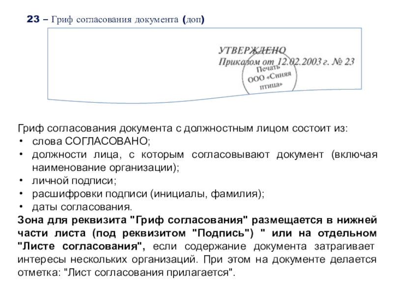 Зона для реквизита "Гриф согласования" размещается в нижней части листа (под реквизитом "Подпись") " или на отдельном "Листе согласования", если содержание документа затрагивает интересы нескольких организаций. При этом на документе делается отметка: "Лист согласования прилагается".