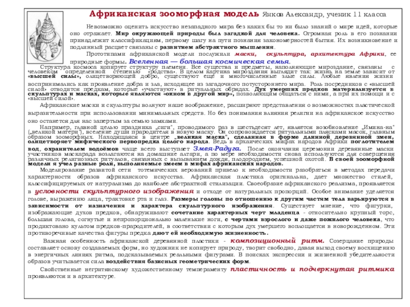 Слайд 24Африканская зооморфная модель Янков Александр, ученик 11 класса