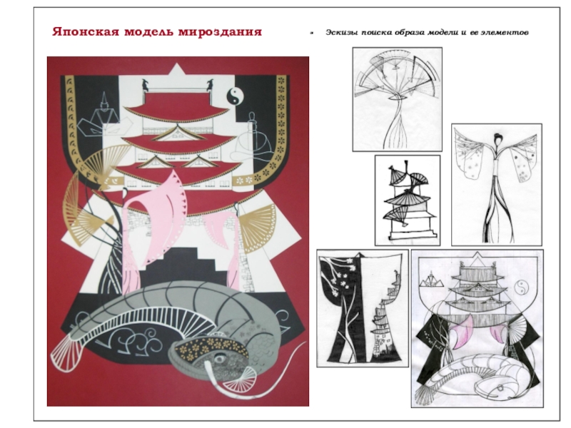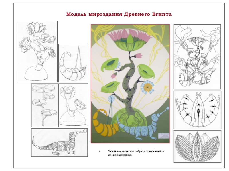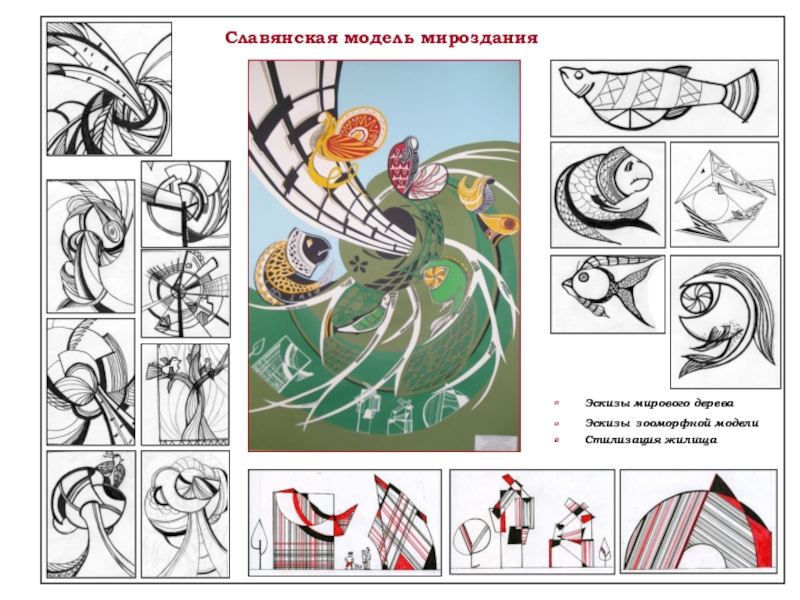 Модель дерева–башни – графическая фантазия, рассказывающая миф о мироздании на языке органической архитектуры с использованием традиционных правил и принципов объемно-пространственной композиции: масштаба, ритма, равновесия, симметрии.