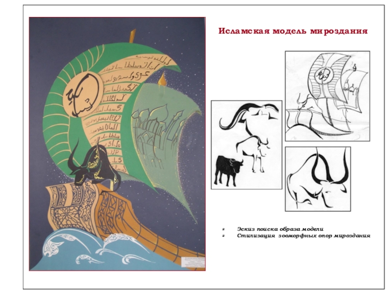 В исламской модели мироздания использованы цитаты из Корана, т. к. божий мир, согласно вере мусульман, открывается им через Коран, его каллиграфия воспринимается как зримая часть божественного откровения. Она священна по форме, так же, как и по содержанию.