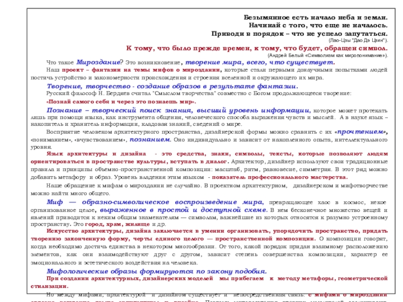 Наше обращение к мифам о мироздании не случайно. В проектном архитектурном, дизайнерском и мифотворчестве можно найти много общего.