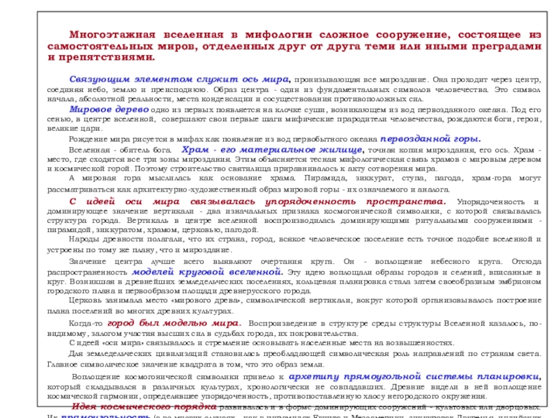 В простой и доступной схеме миф пытался представить бесконечное множество вещей и явлений, превращая хаос в космос, воспроизводя мир в символических образах. Важнейшие из них относятся к разумно устроенному пространству. Это город, храм, жилище и др.