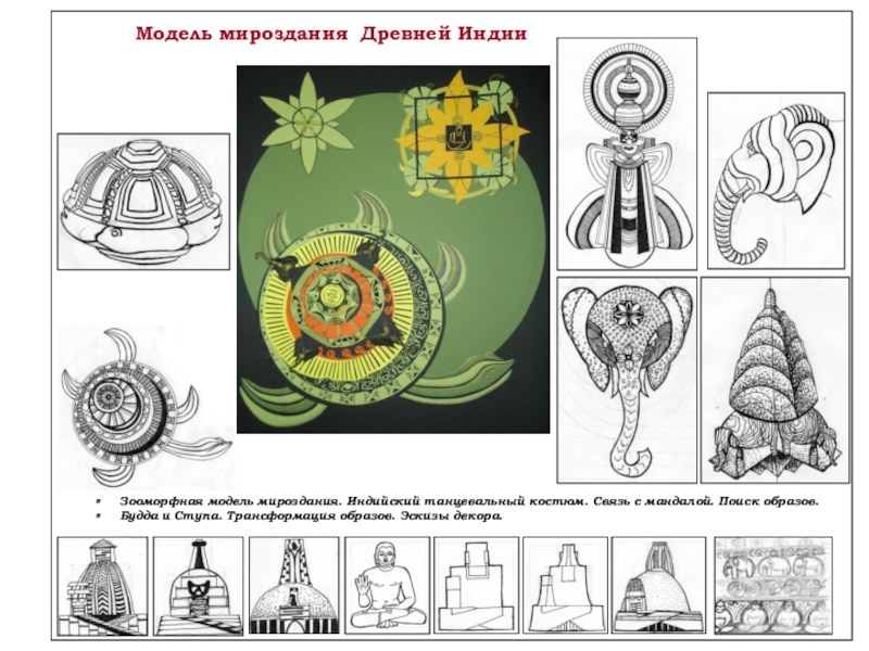 Слайд 11Зооморфная модель мироздания. Индийский танцевальный костюм. Связь с мандалой. Поиск образов.