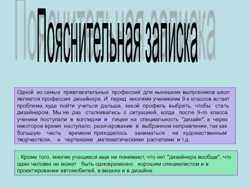 профессия дизайнера. И перед многими учениками 9-х классов встает проблема, куда пойти учиться дальше, какой профиль выбрать, чтобы стать дизайнером. Мы не раз сталкивались с ситуацией, когда после 9-го класса ученики поступали в колледжи и лицеи на специальность "дизайн", а через некоторое время наступало разочарование в выбранном направлении, так как большую часть времени приходилось заниматься не художественным творчеством, а чертежами ,математическими расчетами и т.д.